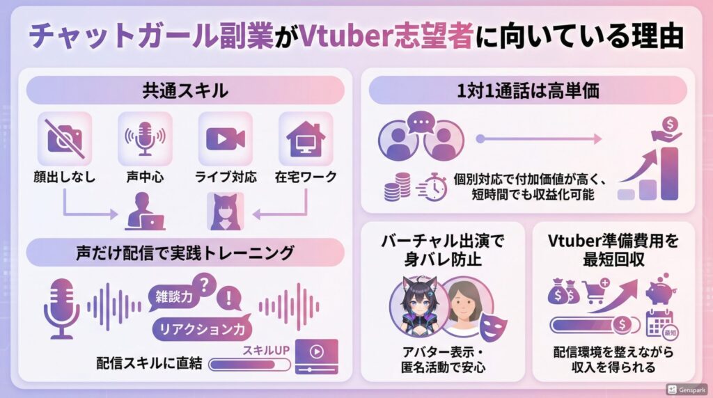 「在宅」「顔出しなし」「声中心」「ライブ対応」という共通点があり、vtuber 活動前 副業として実践的な経験も積めます。