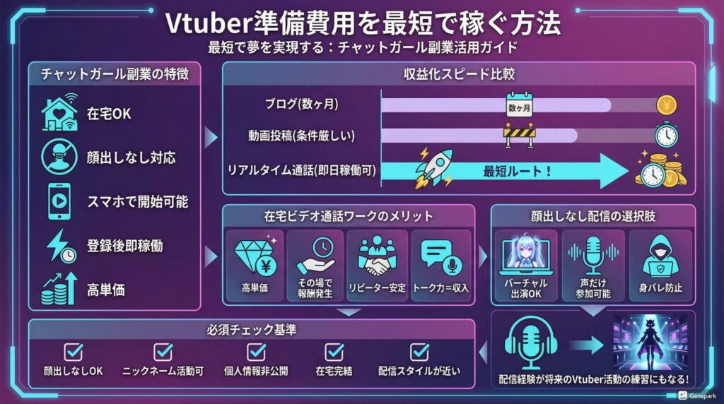vtuber 準備費用 稼ぐ 方法を探しているなら、結論は“即収益化しやすい在宅配信系の副業”が最短ルートです。