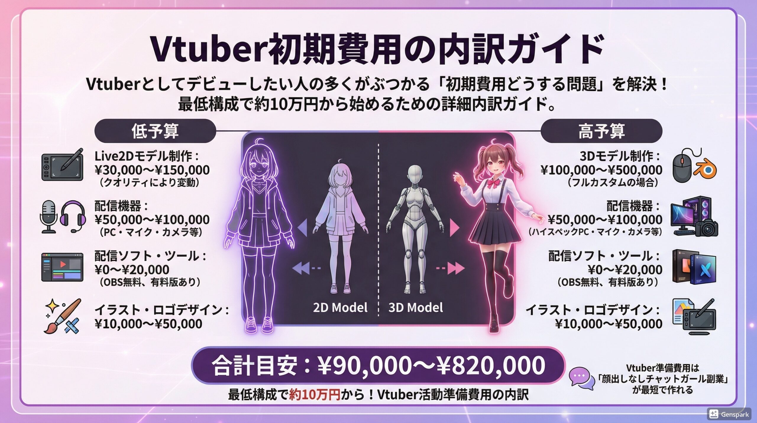 vtuber デビュー 資金を見積もるために、主要コストを押さえておきましょう。